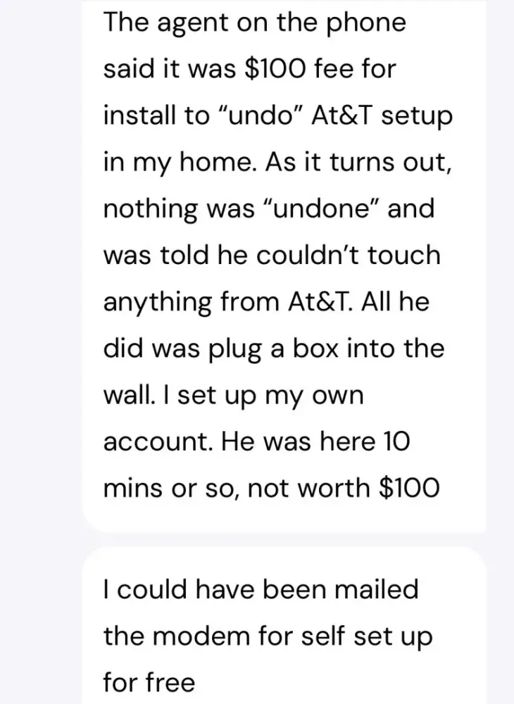 I requested service for my home. My community is HOA and the service is included in my fees. The phone agent said it would be a $100 fee to have a tech come out to install because he would need to “undo what AT&T did when they added serviceâ€. She also said, she could just send out a modem but couldn’t guarantee it would work without a tech coming by...