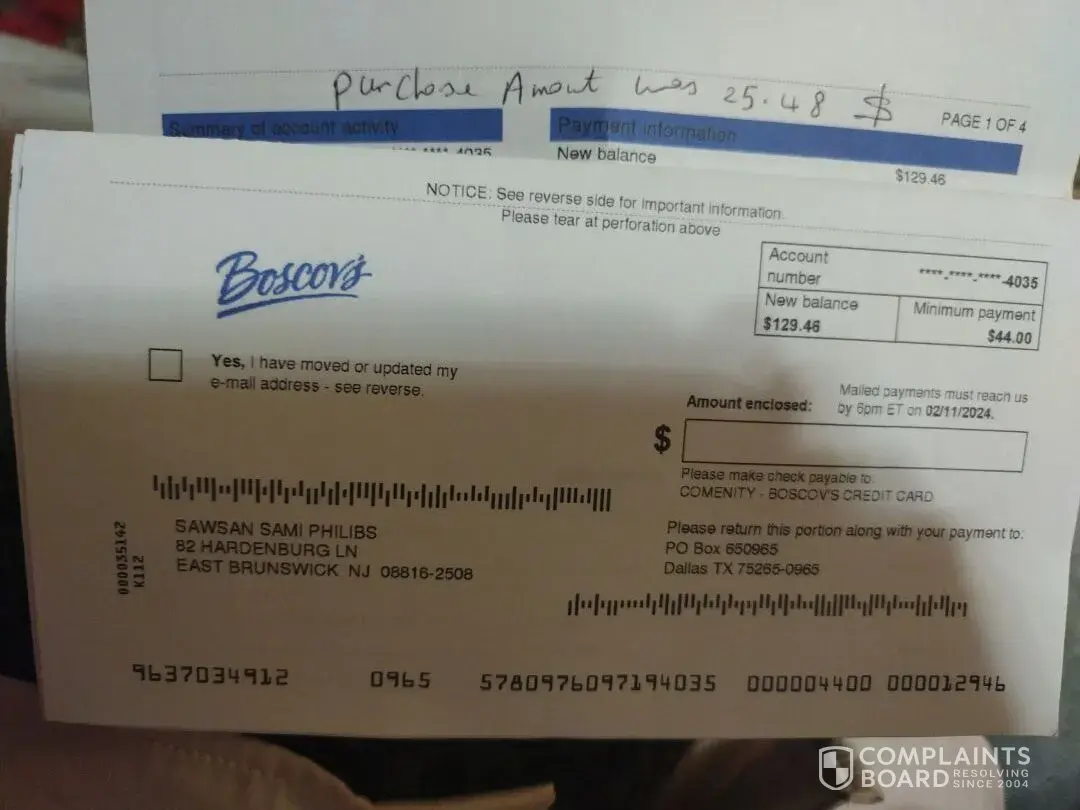 I had shopped from boscove store in Woodbridge,NJ. many times,and was paying cash.except the day they offered me to apply for boscove credit card.I only had one thing bought by this card(temporary) was 24 or 25 dollars. After very long time,they sent the card by mail,with statement say /purchase amount +late fee charges equal almost to the purchase...