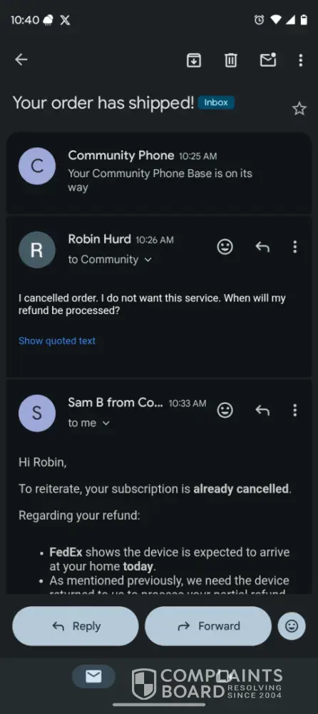 I called Community Phone in early November to inquire about their landline service. I explained that I would need to make frequent calls, and the Community Phone employee stated that it would cost me approximately one cent per minute. I called again and another employee confirmed the same rate, so I signed up for the service, but requested that the required landline device be sent no earlier than November 15, when I would be available to receive it. I also asked the employee to send me an email confirming the one-cent-per-minute long-distance cost, and she assured me that she would handle both matters. However, that email never arrived, but I did receive one on November 4, stating that my service had been activated, followed by a November 5 email stating that the device had been delivered to my address. I responded by email with another request for confirmation of the one-cent-per-minute rate, and then contacted the company by phone to ensure I would not be charged for service prior to November 15. During that conversation, I asked again for confirmation of the one-cent-per-minute rate, and the employee directed me to a website which showed rates several times higher than what I had been quoted. The highest rate I saw was 36 cents per minute, with no explanation of which rate I would receive. The next day, I called the company again and spoke to the same employee, detailing the history of my interaction with Community Phone and expressing my dissatisfaction. The employee told me, and confirmed by email, that if I shipped their device back, I would receive a full refund, including shipping expenses. Later, however, the company refused to pay my shipping expenses. Instead, they continue to send me emails, the last of which states that I may be eligible for a refund if I return their device.