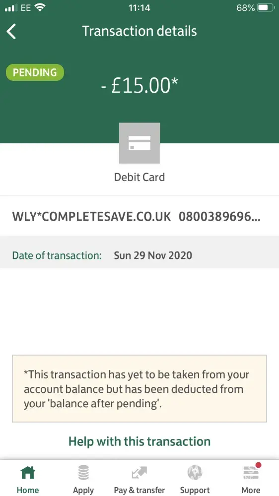 Ive just realised as i thought it was my bank taking an account fee. Tht Wly complete save have been taking £15.00 out of my bank account since at least june 2020 thats around £90. Im fuming i have not authorised this in anyway i do not give my bank account details to anyone and only use a small handful of online shops and never fill in online pop ups. So i classify this as stolen money and stolen personal details. Im out of work due to covid 19 and this has is not helping. I will be making complaint to the bank and financial ombudsman.