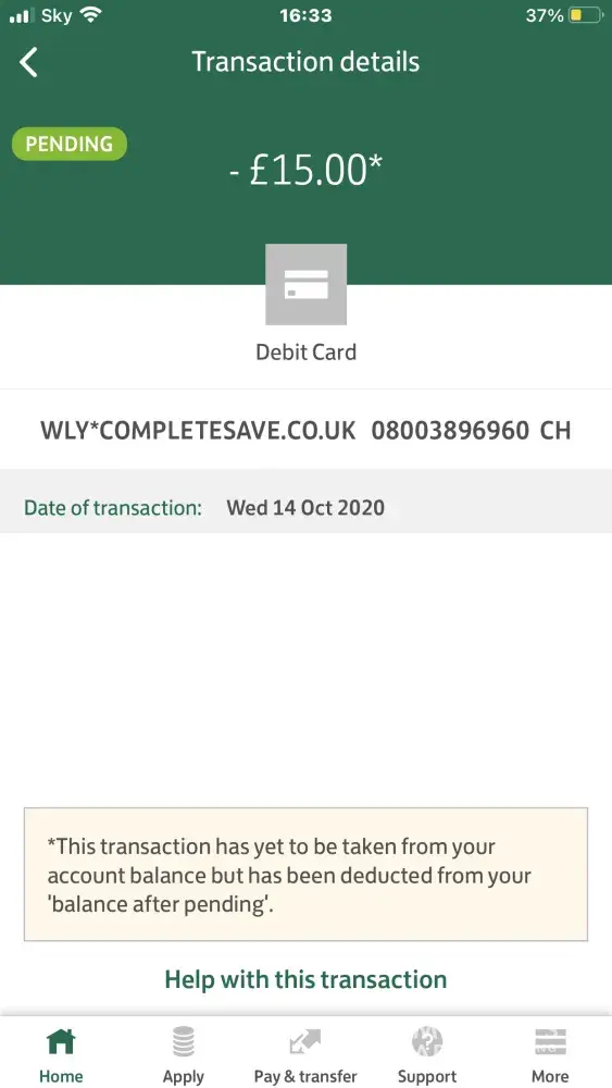Hello, I have had two transactions on my bank account from complete save, taking a total of £30.00 out of my account without my permission. The first was take out on 22th September and the second today, 12th October.