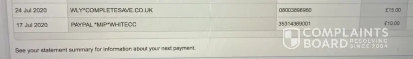 I've just gone through my bank account for the last 1 year and seen you have been taking £15 a month from my bank account. It takes me long time to figure out why it has happended. Eventually I remember that I have a place an order through completesaving.co.uk in august 2019 and from that time they started to charge me regularly without my authorization.