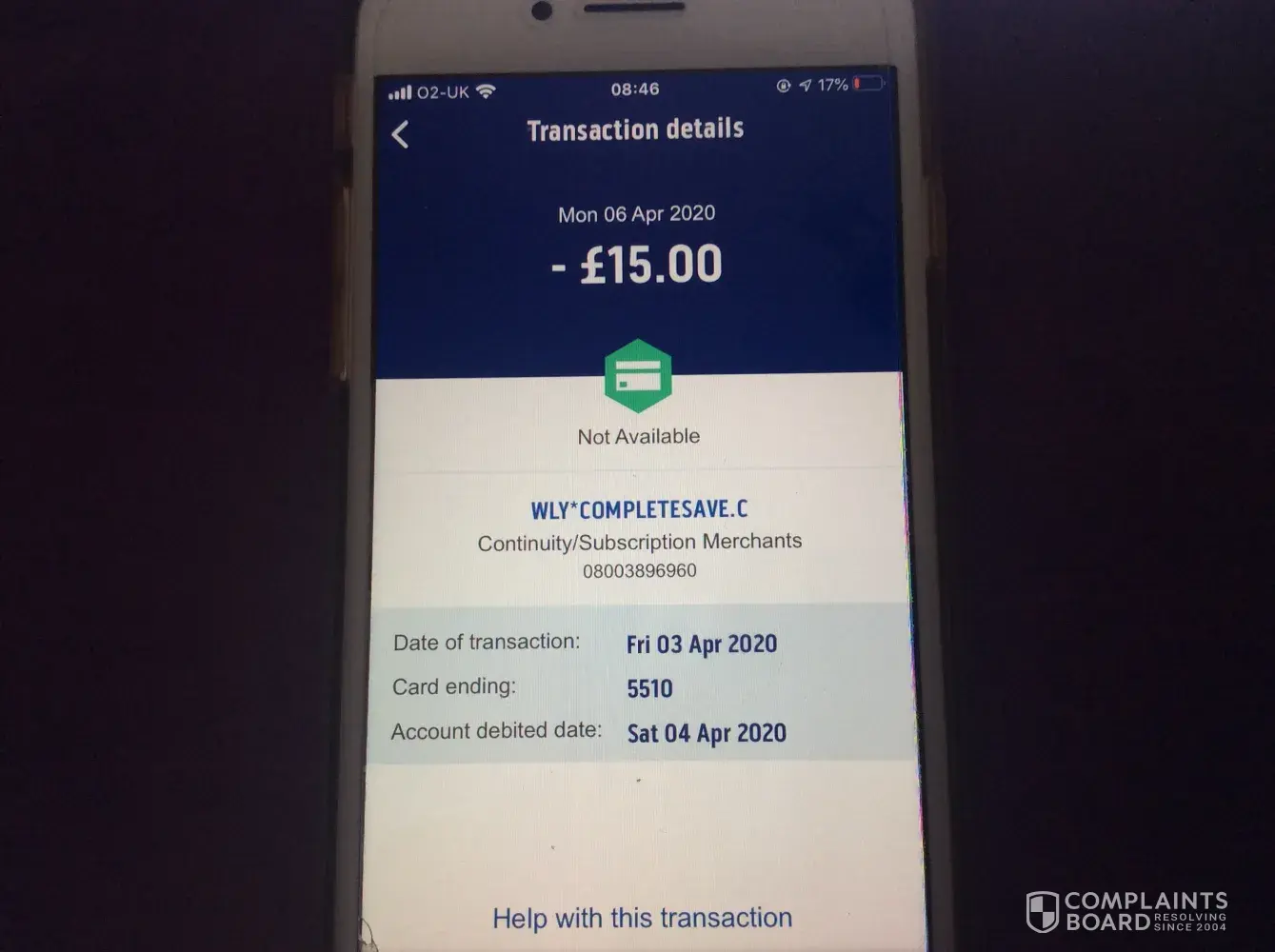 I do a small amount of online shopping usually, but at no time have I requested to join the Complete Save savings plan. I have only just discovered this fraud. I want a full refund and I have notified my bank regarding this. Last payment that was taken was on the 3rd April of £15 WLY also managed to take another payment last month without my consent.