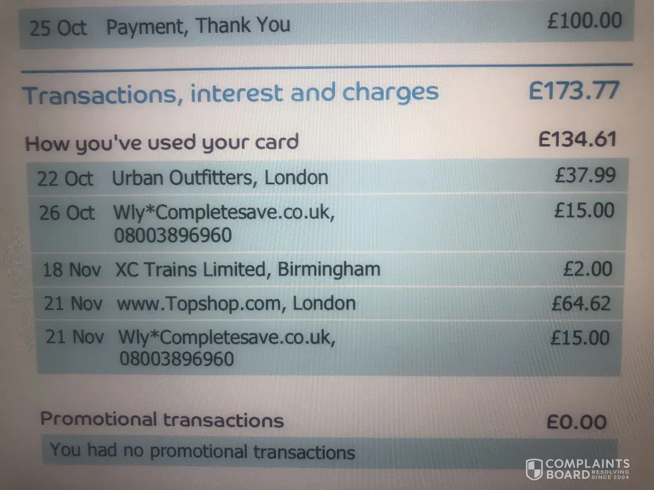 From what I can discover the first unauthorised credit card charge was 23rd March 2017. It writes Wly*Completesave.co.uk, [protected]. One time is wrote Eysins .
