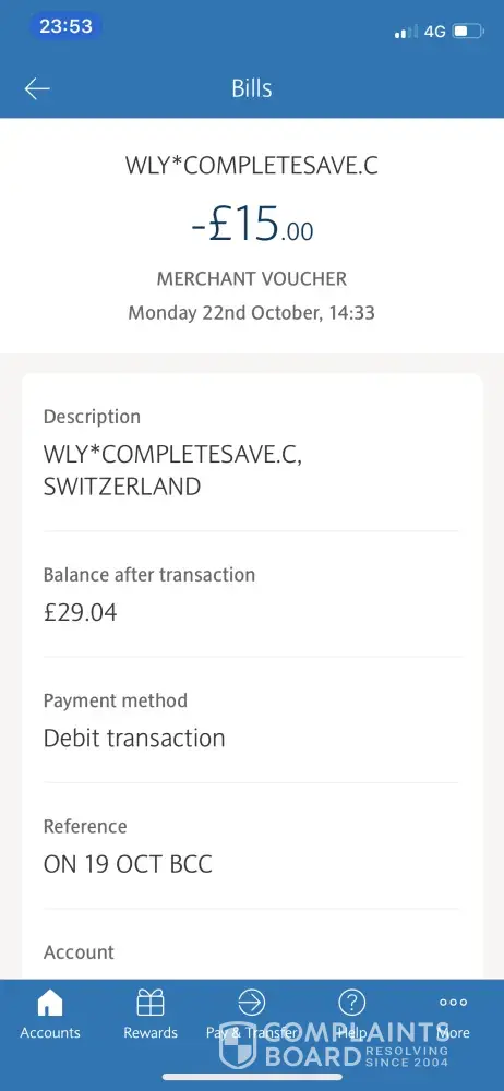 I have just checked my account and £15 has been taken from my account without my permission or notifying me! The company that has charged me is called wly*completesave. C switzerland. It has just taken the last money I have which I need to get to work kn the morning! I am disgusted that this is even possible and I demand you refund me immediately! I will be takimg this further! I do not use online shopping or anything like it. This is the first time I have been charged and it had better be the last! I will be reffering your company to my bank's fraud dept if you don't refund me asap! Pleasr ket me know what information you need from me to refund me. This is appalling that you can get away with this!