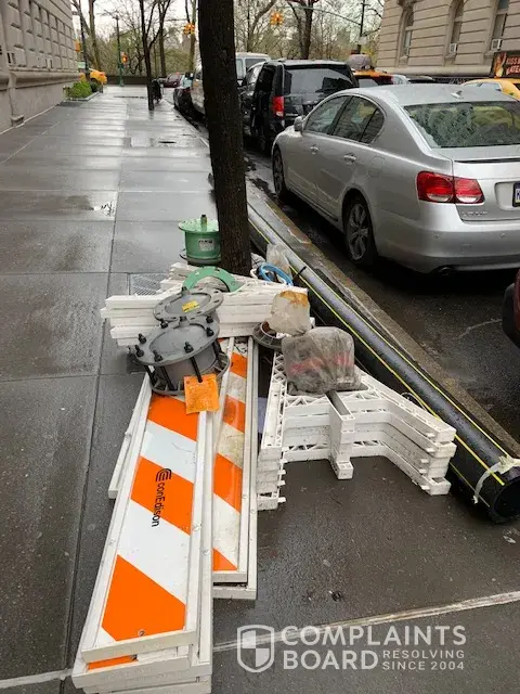 For over a year now, con edison workers, working in the street left plumbing parts and piping on our sidewalk. Can someone please have it removed? It is located on 74th street off the corner of central park west in manhattan. I filed a complaint with the city, a violation was issued but the material still sits there. Please, please, please have it removed.