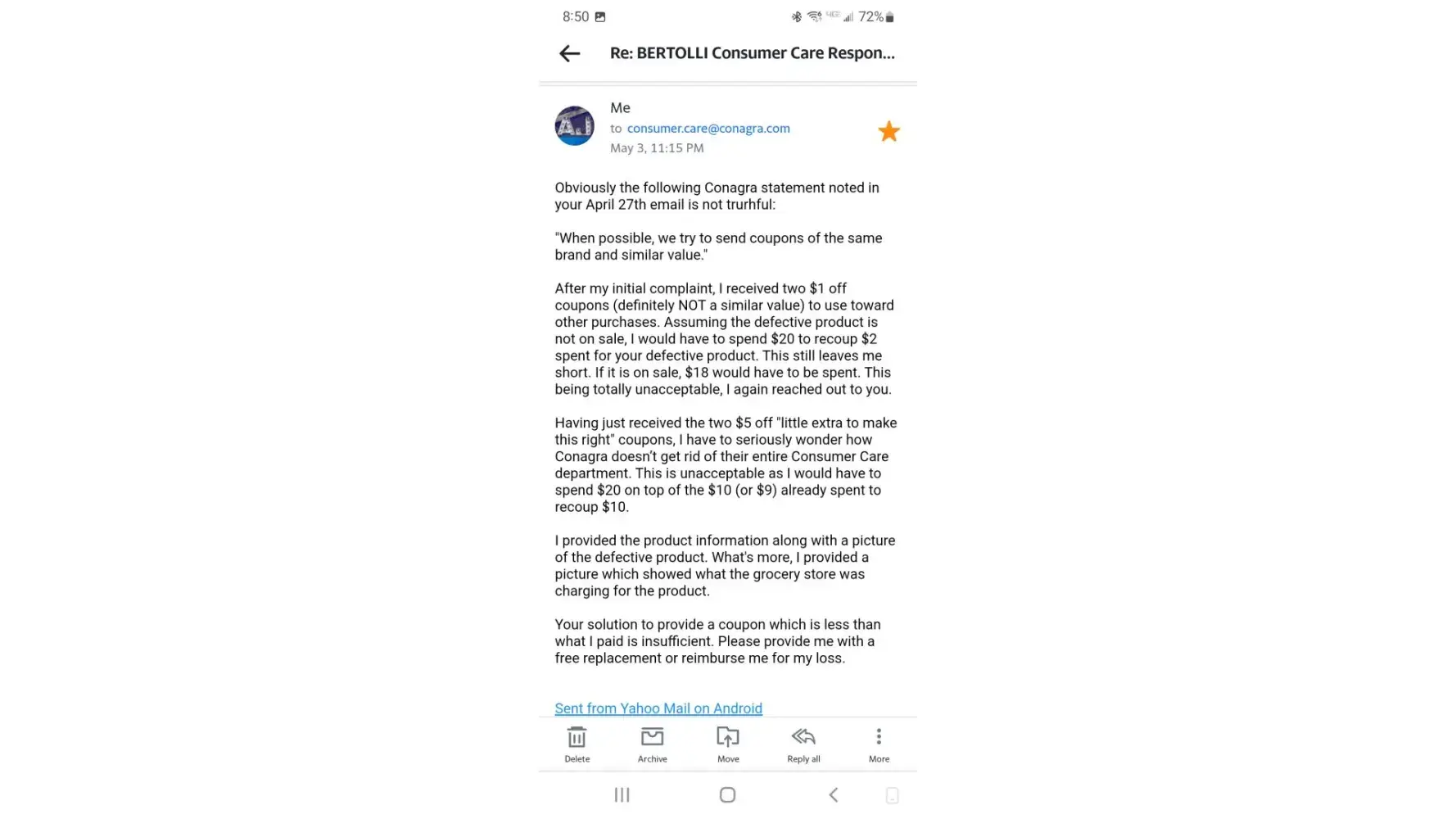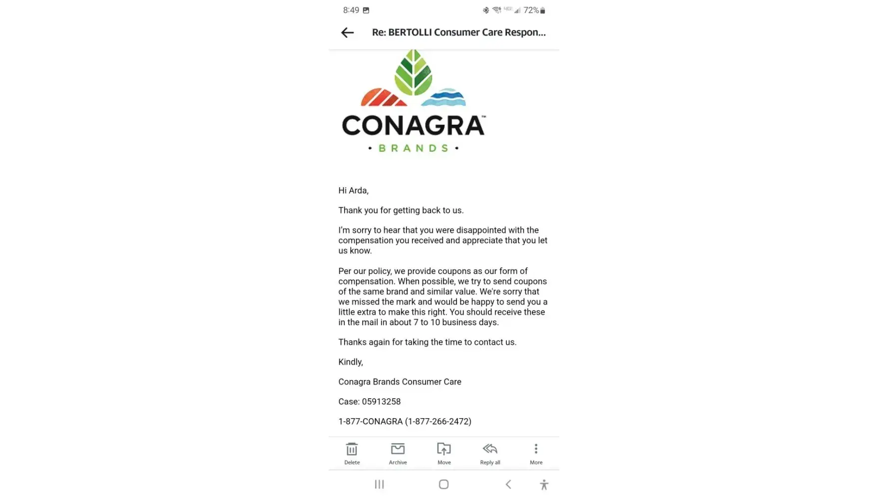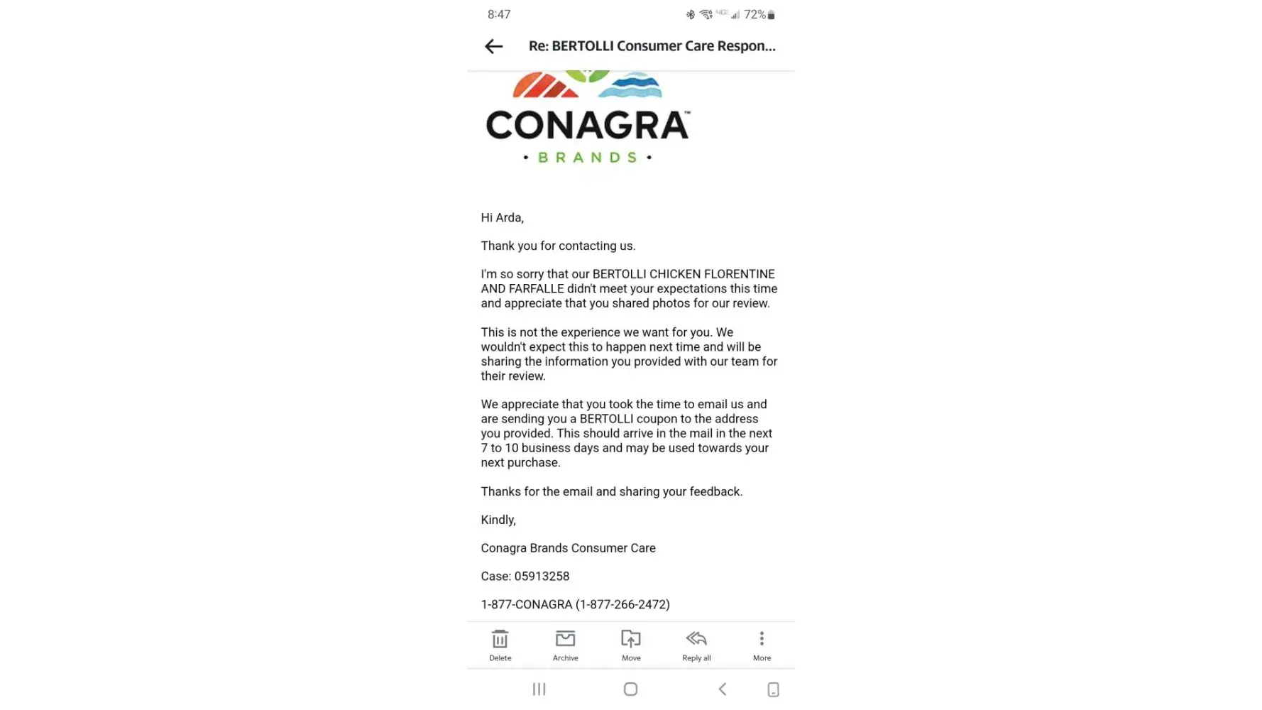 A Bertolli complaint search took me to Conagra. So last month I completed their form. An acknowledgment was received, case [protected], and subsequently two $1 off coupons.