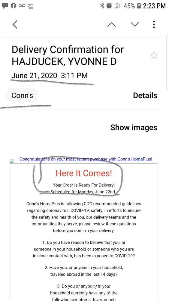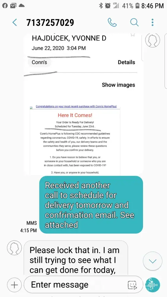 I expect a phone call as soon as possible to get started on resolving these serious issues with Conns Homeplus. Thank you very much four your assistance.