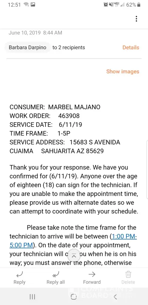 This is what I sent conn's and have not heard a response. They were supposed to send out a tech to a scheduled appointment yesterday and the tech never showed.