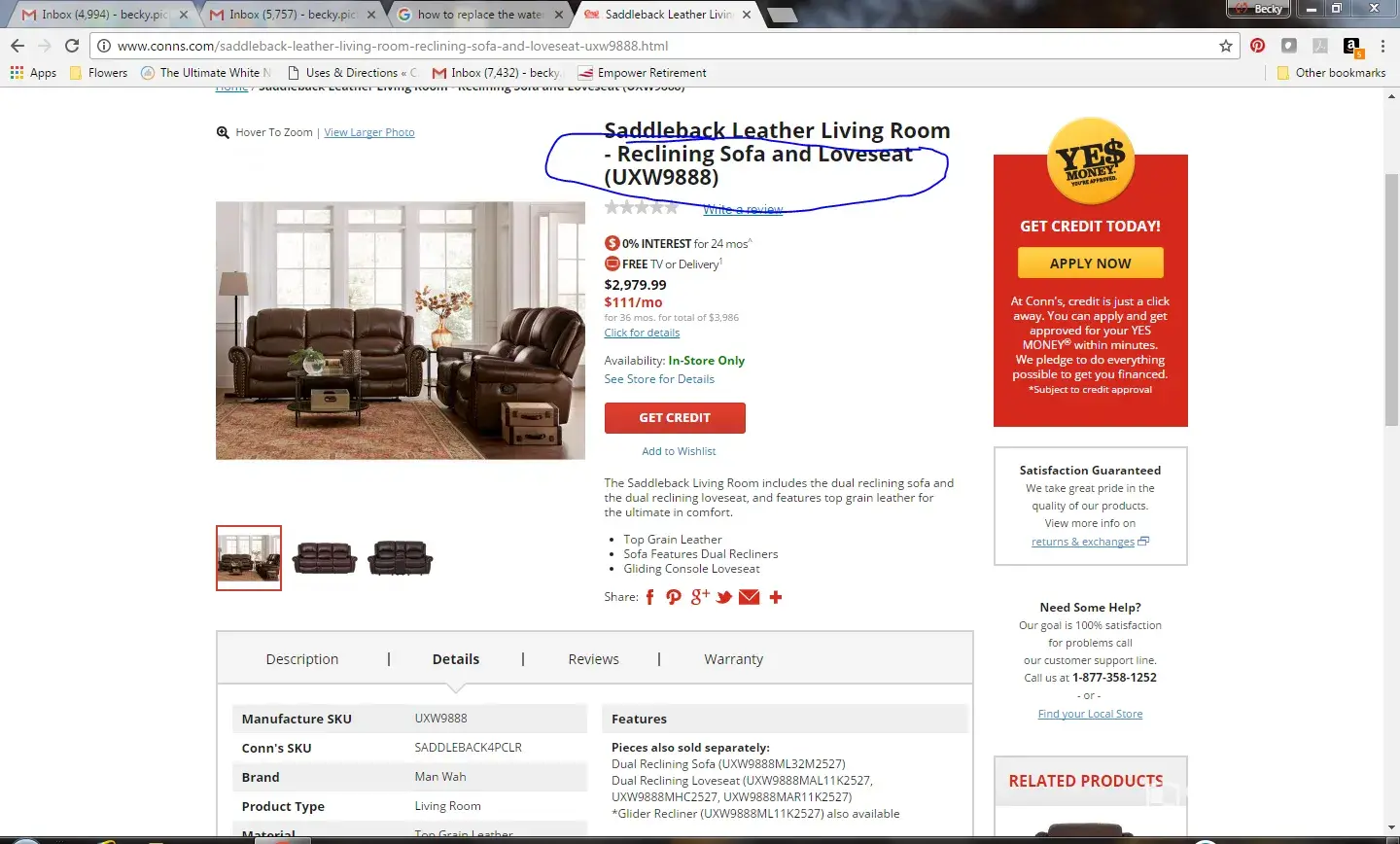 Finally, after getting to the bottom of it the newer, well made set that I chose - the loveseat now ships in 3 separate pieces to be combined together at delivery, BUT, therefore having 3 SKU#'s rather than the one - even tho THEY constitutes ONE (1) loveseat. The Salesmen and Customer Service Rep said they have to "exchange 2 pieces for 2 pieces." I am attaching the picture to this email. I don't care if it comes in 50 parts when the deliverymen put it together it is one loveseat - I want this sofa and loveseat. Please make whatever computer entries that need to be made.