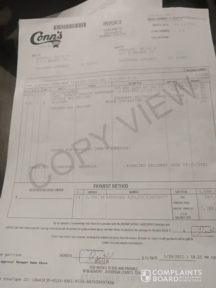 all wrongdoing. When sales associate person darnella christal told me that I was covered fully whether it is accidental damage physical damage breaking burglary fire whatever that means I'm covered and when I'm told that the company needs to stand by their guarantee they're not doing that which is why I'm also aware that snap finance progressive finance and several other companies are dropping conns because of their business practices I mean the guarantees a guarantee to this day the TV has not been fixed and my account is still in good standing condition I would advise people to find somewhere else to shop there are so many people that have messed up washers dryers that work for 2 weeks and then stop working this stuff is supposed to be brand new how do we not know if any of this stuff is refurbished? Their customer service is absolutely horrible especially when it comes to there service department they are rude they are misinformed and no one communicates within the company I was misled as a customer I will never do business with these people ever if anyone decides they want to do business with people who cannot uphold their guarantee on a product that they sell a customer only to be redirected and deflected without stating in their contract which is not covered although your sales representative tells you that you are don't believe it because you're not you will get sold and extended warranty and sent on your way thank you you're covered they charged me $559.54 for extended warranty which brings the total amount of the TV to $3, 999 and this is for a 75-in Qled TV which they refused to repair not only that but when you call the insurance company they have no record of me at all but yet I have the paperwork for it and the receipts to prove it one pissed off customer a good one y'all just lost for life
