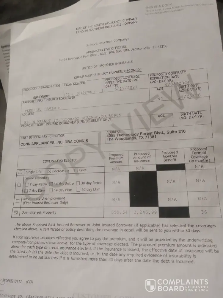 12/16/2021 Acct #[protected] I recently made a purchase through Conn's and was approved for a loan. I spoke to my sales representative Mr. Tilley who stated that he would need to add the insurance for the appliances but that if I was able to take my homeowners insurance in to the store he would take that off of my owed balance. A few days ago my husband...