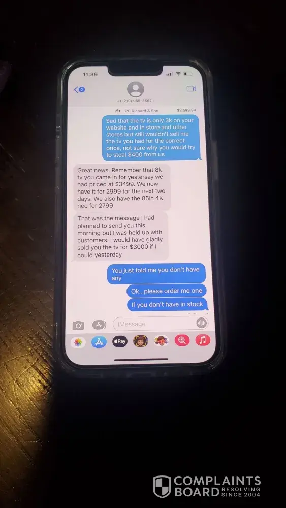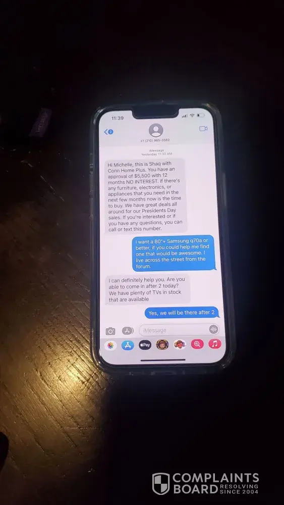 We applied to get a loan for a TV I have been wanting upgrade for about two years but just had to replace my wife's TV last year so we waited. I had been studying to know exactly what I wanted. We got approved for $5,500.00, we applied online. Then Shaq from the Forum in Selma, TX sent us a text to see if he could help we said yes and he told us to come in after 2pm. We got there right about 3pm, waited about 10 to 15 mins for him to finish helping another person. He then came to help is pick a TV out. We decided on the NEO QLED Samsung 75" there was the floor model that was marked down to $2,700.00 $299.00 off original price. I asked do you have a new one, he said yes. I said I'll take it he said that will be $3,400.00 I said it clearly says on the tag original price is $2,999.99. He said hmmm, let me get my manager, so young guy ce out and said it's $3,400.00. I said it's marked as original price as of 02/18/2022 at $2,999.99. He said well that was a typo and removed the tag. I said we'll I guess ypu lost a sell, I didn't come to look at tvs I came to buy one. Then I think the real manager came out and asked them what happened as they were arguing and we walked out the door. No one tried to talk to us to see if they could clear things up or apologize for false advertisement in their own store. I guess I'll have to go buy it somewhere else now. Pretty sad I wasted all this time, excitement, energy for a huge disappointment and just feel gross now. I guess the name fits the description there at Conn's. I have pictures of the tag before they could remove it. The tag was made on 02/18/2022 it's 02/24/2022. Sad the original price of an old TV a 2021 model which will replaced in two weeks with a 2022 model went up $400.00, I really wanted that tv. I would have loved for them to honor there original price marked as of 02/18/2022 on 02/24/2022 on their 2021 line up while I was in the store. Sad to see it was so empty as usual I go to the forum a lot I'm surprised they didn't sell me the new one for $2,700.00 since it doesn't look like they sell anything in the forum location