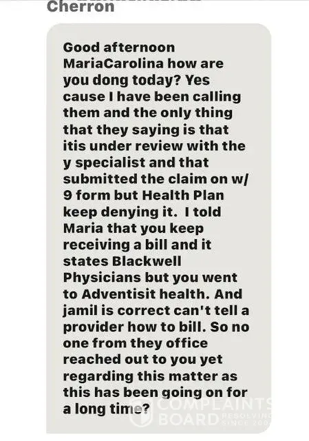 Adventist healthcare Imaging dba Blackwell Physicians is unwilling to work with my insurance company to get a claim paid correctly. They are short staffed, thus do not contact the insurance at all and once the insurance denies a claim, they just make the customer responsible knowing that they are not billing correctly. I have dealt with AHC since November...