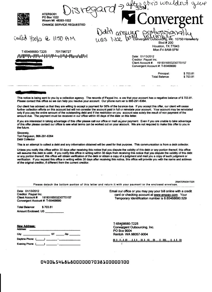 We received up collections letter stating that we owed $703.81 for a past-due PayPal account. We have not had a PayPal account and over two years and this raised a flag. I called the 1866 number and a lady answered, saying "hello" and I asked her if this is convergent. She said yes that I explained to her. I do not have an account with PayPal. She proceeded...