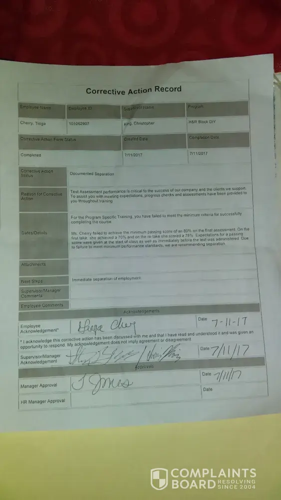 101062907I worked for Convergys for ATT contract for 18 months I ranked 4th highest performer in that department. Convergys lost c ontract with ATT and sent me over to H&R Block. Had to train for Appt scheduler went to training for 2 weeks took test on Friday July 7, 2017 failed with a 70 retook test on Monday July 10, 2017 trainer Christopher King came over and act like he was checking over my test and started clicking and changing answers and than submitted test and I didn't pass had 78 out of 80 and a couple of my questions he changed were wrong and than he said don't worry about it. Than on Tuesday July 11 2017 had me sign a separation letter. I don't believe I ever passed the H&R Block assessment test. Convergys sent me over there to fail. It's a drug environment and if your not on drugs you don't fit in. but you will get fired if you have your cellphone on you.