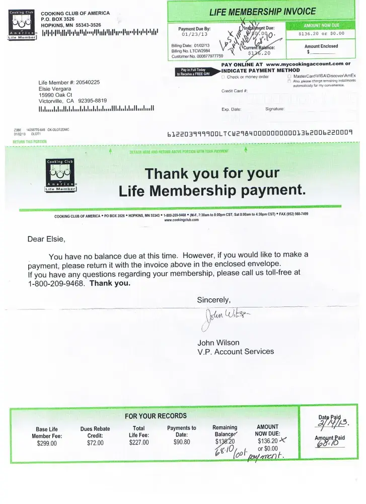 Elsie vergara life time member # [protected] last billing date: 01/23/2013 billing # ltcw2984 customer # [protected] I am a lifetime member of cooking club of amierica, member #[protected]. I paid all my dues, used to receive the magazines for free as a lifetime member as well as my choice of testing products. Now come to find out that the website no longer...