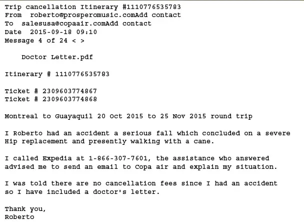 I booked a return flight to Ecuador 3 months ago on Expedia.ca for the date of Oct. 20 to Nov 24 2015. A couple of weeks ago I had an accident, I slipped down the stairs while working and ended up with severe damages. I visited my doctor and had an xray on my back and hip. The results stated that I had 7 ruined discs on my spine and I need a hip replacement. I contacted both Expedia and Copa Airlines to cancel my trip. They both gave me the run around sending me back and forth and I never heard the end of it. I sent a doctor's letter to both Expedia and Copa Airlines stating I have a severe right hip damages. Nevertheless they both ignored my situation and have not replied. I asked to cancel my trip and waive the penalty fees since I had an unexpected serious accident.