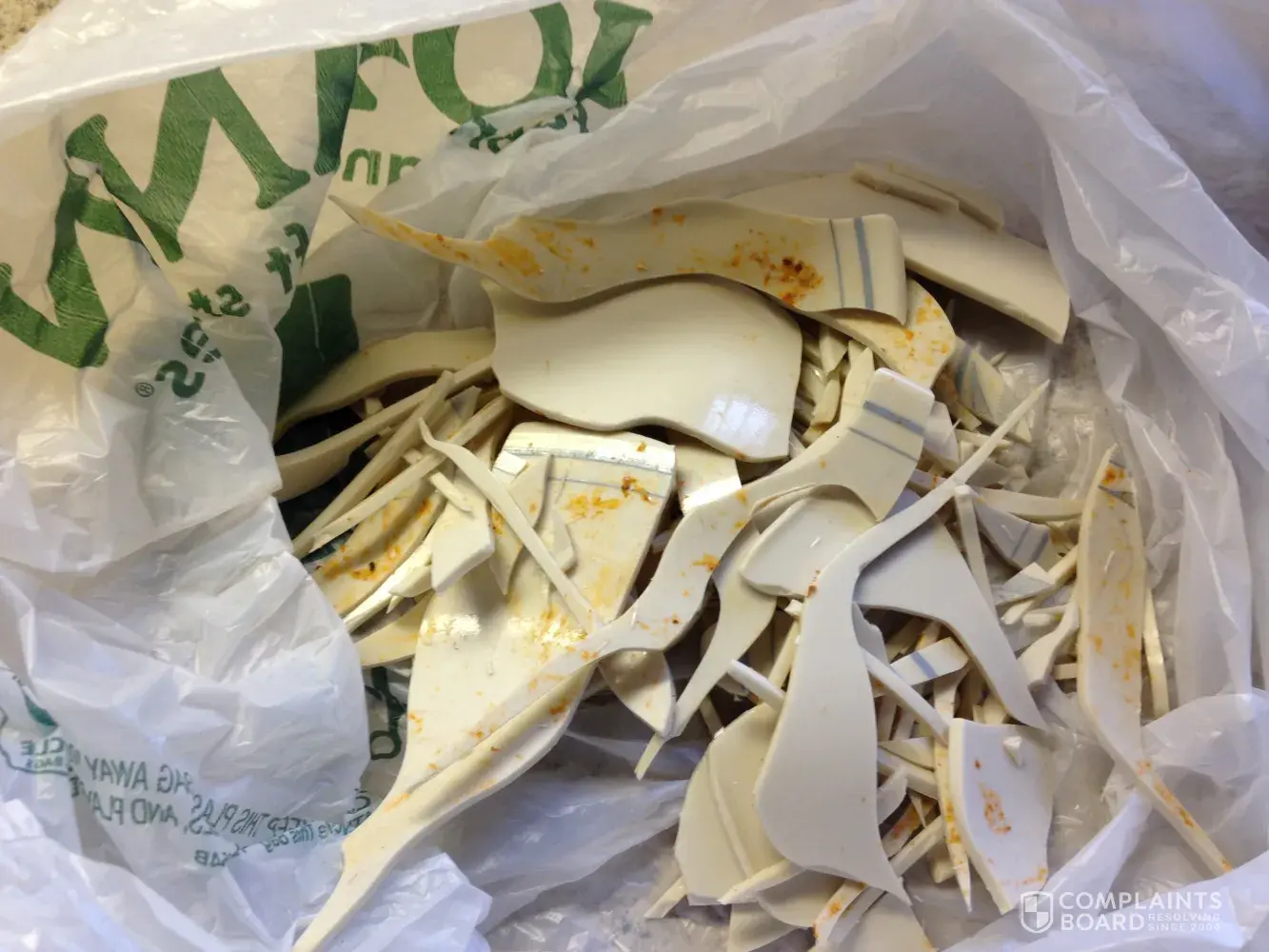 unpacked my dishwasher and a bowl splintered into two large and many little pieces. Some of shards got into drain pipe of dishwasher and now it needs fixing.