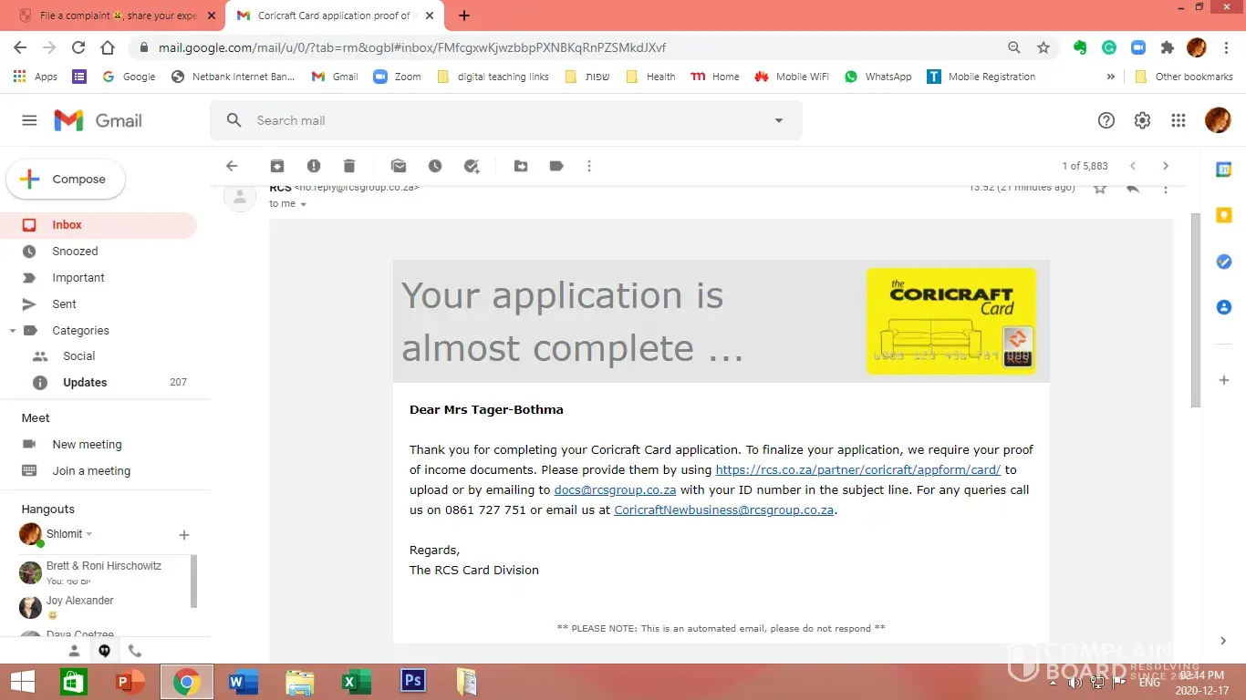 on the 17th of December, I filled an online form, in order to ger The Coricraft Store Card. On the pamphlet, it says "Now, easier than ever to apply". This is a lie. When it came to the sensitive part of the form, I could choose to EITHER give permission to Nedbank to release bank statements to RCS OR to attach payslips.