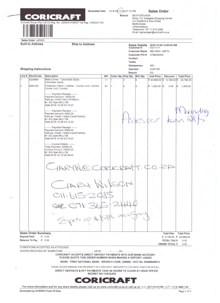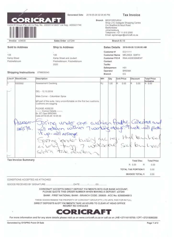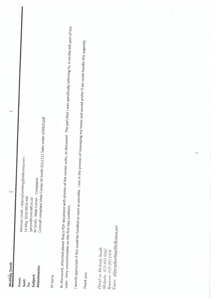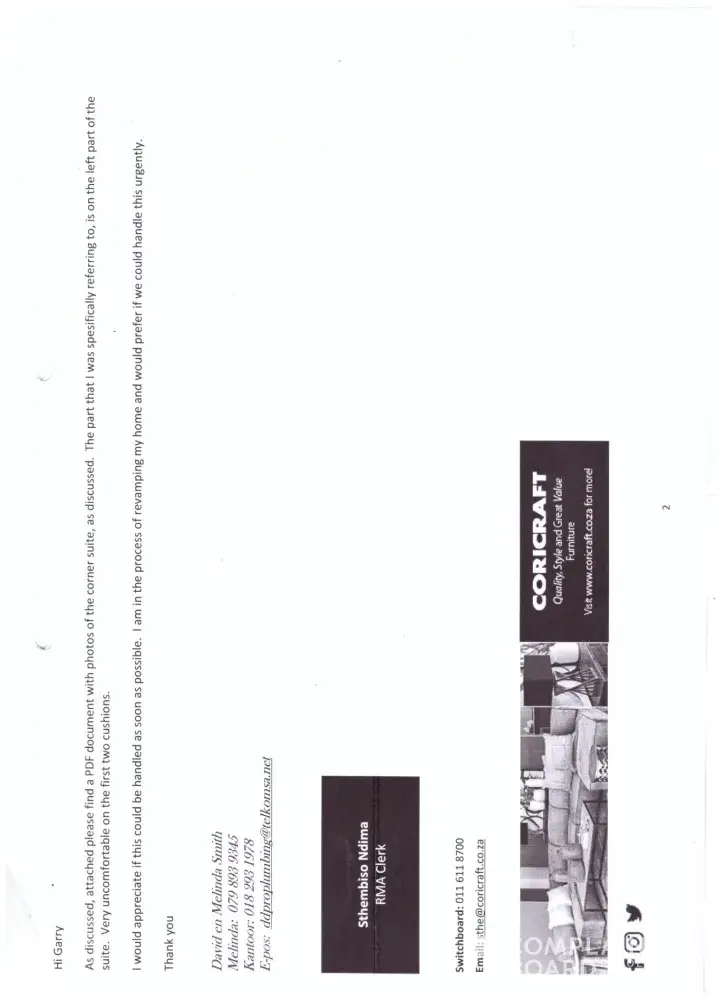 In addition to all this I also had a query with consultant from Mall of the south the previous week who didn't give correct info regarding delivery dates. I complained to the store and also asked for an email address of her superior who I may complain to and I was given the email address [protected]@coricraft.co.za and I sent an email to this email address and again I still have not received a response. I also sent an online query labelled complaint which has also not been responded to. I can provide this email if required.