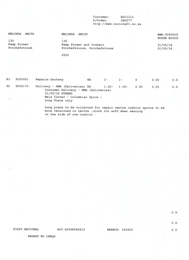 I called Coricraft and spoke to a lady expressing to her how upset I was, and she transferred me to her superior. I cannot remember her name, but I think it was Brenda. I explained to her that I was very dissatisfied because Coricraft is known for good quality furniture, and I told her that the whole situation was unacceptable. I asked her to take it further to her superiors. After she had consulted her superiors, she then said that they would deliver a loan couch on Monday, which is today, and that a new couch would be delivered in 3 weeks time. I asked her to confirm our conversation by e-mail and supplied my e-mail address as [protected]@telkomsa.net. I never received this e-mail.