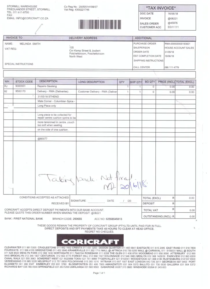 My husband and I went to Coricraft in Eastgate Shopping Centre on 13 July to buy some couches and other furniture. We saw couches that we like, and confirmed with Gary Wilson that they are indeed in stock before we paid for the couches. Gary assured us that they have the couches in stock and we proceeded to pay for them. We also advised Gary on the same day that we will be moving to our new house on 01 August 2018 and would like for our couches to only be delivered then. He agreed and advised that it is in order.