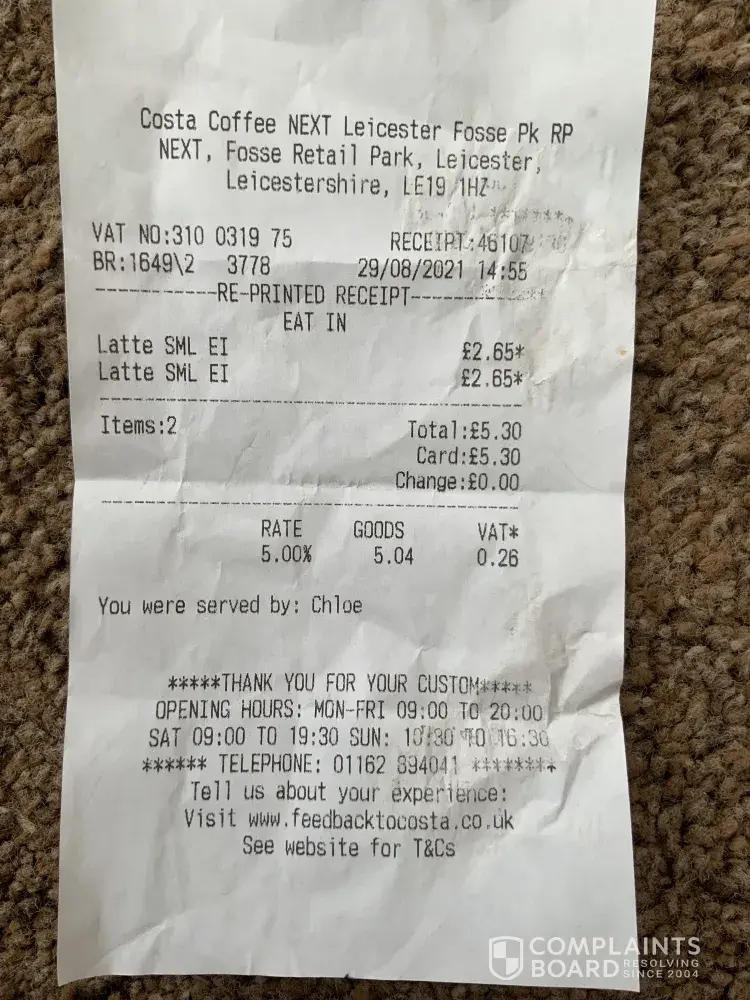 Today I purchased 2 lattes at your outlet in Next Leicester Fosse Park LE191H