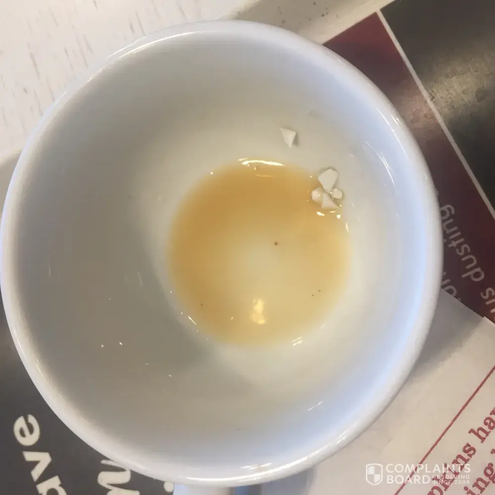 On Friday 10th November 2017 at around 0930am I attended this store and purchased a tea for myself. I received one cup and one small tea pot and small milk jug containing milk. On finishing my tea I noticed a number of sharp broken porcelain pieces at the bottom of my cup that I had been drinking from! I was unaware where the broken shards of porcelain had come from or how they got into my cup. I was obviously shocked and very concerned as to whether or not I had swallowed any shards. I alerted the manager present, who originally served my at the till point who introduced himself to me as Mr Joe Fams. On closer inspection it appears that the milk jug I was provided with, was broken from the inside. It appeared that the broken shards of porcelain originated from there and obviously could not be seen by myself as they were covered with milk. He took down my personal details and contact email and offered me a free cupcake and drink which I appreciated - his customer service was good. Please enclosed and attached images: