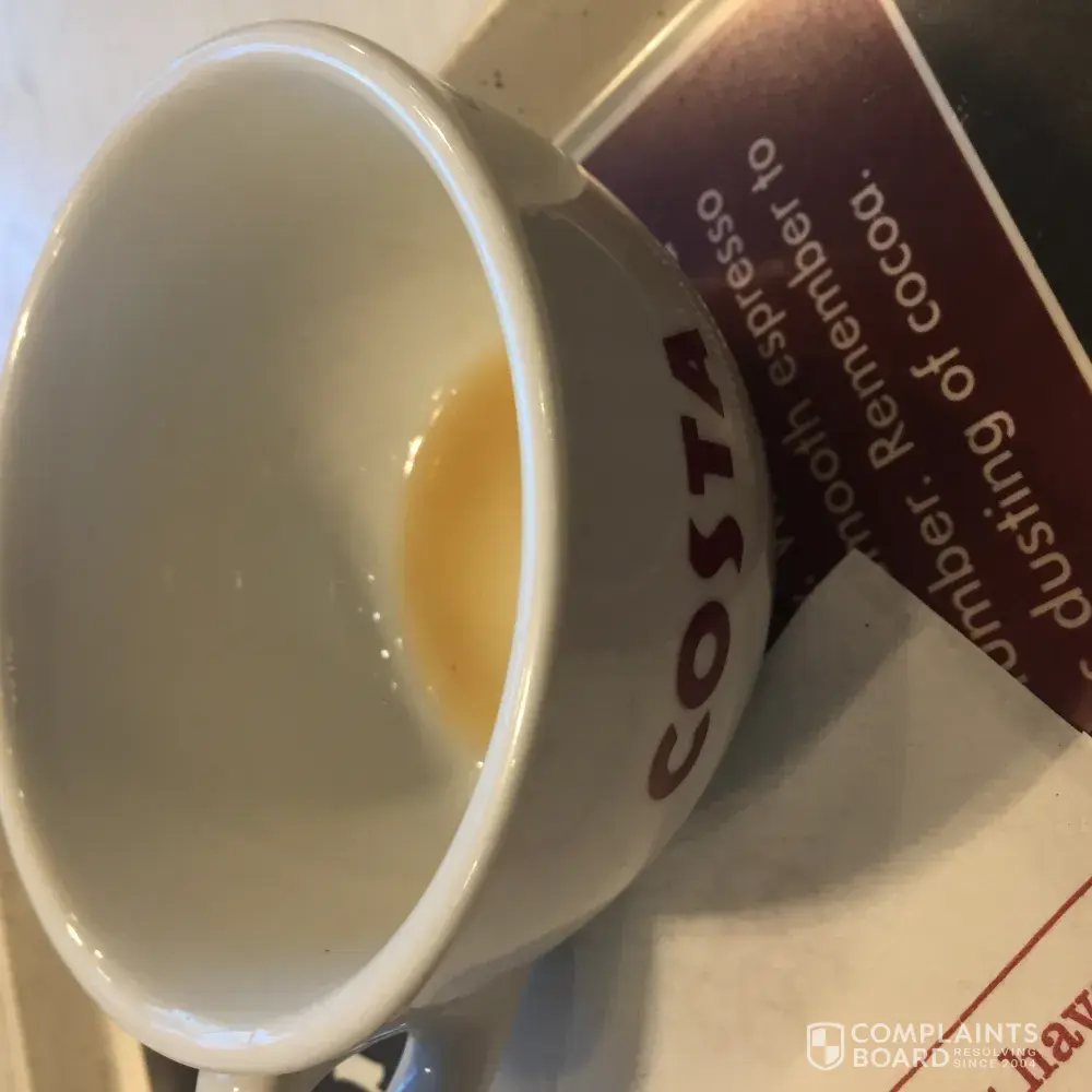However, I have not received any contact from Costa head office regarding this experience which I find appalling considering the serious risk this posed to one of your customers. Should this have been a small child's drink it is likely there may have been serious implications involved, it is very dangerous.