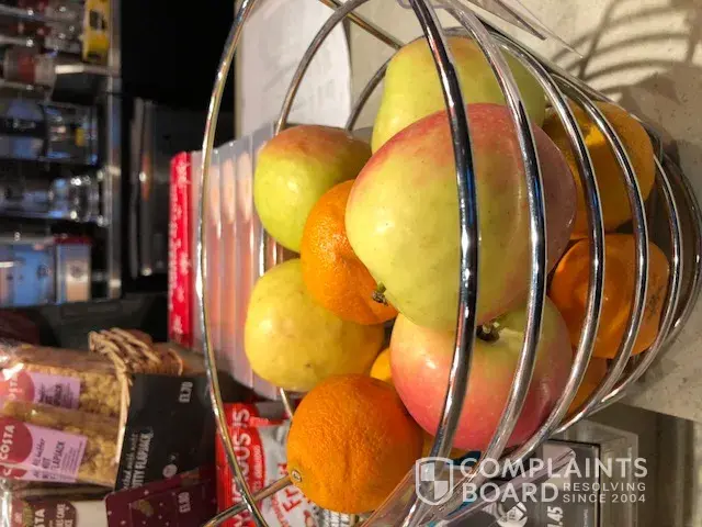 There was also a silver fruit bowl with rotting fruit at the other end of the counter.