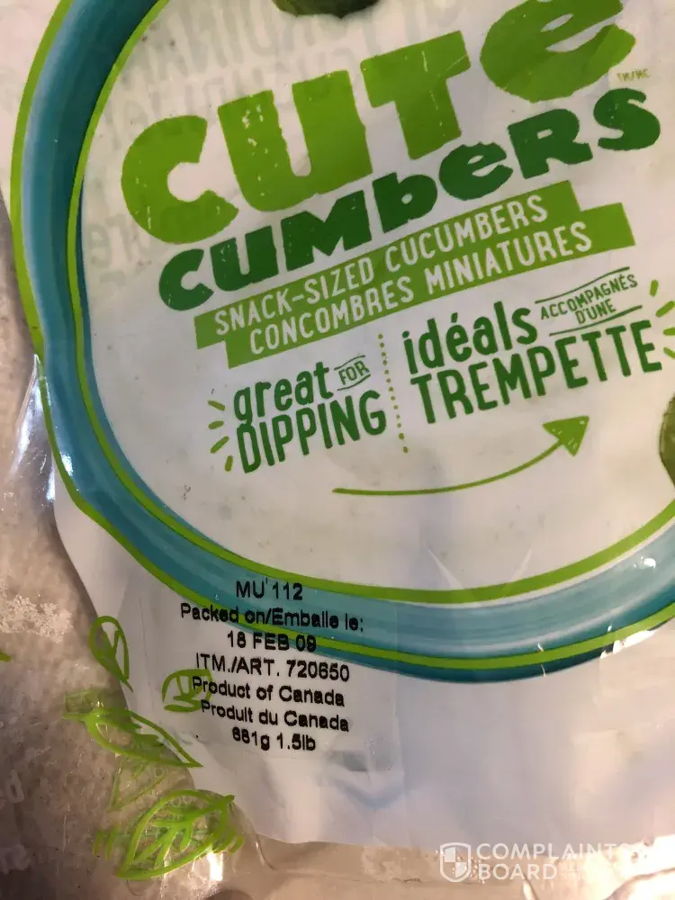 I purchased these snack size cucumbers on feb 24th from avon costco, ma. When I opened the pack at home, most of them were stale like they are very old and had developed a smell like very old cucumbers do. The tips were dark in color and they had started to go bad. I checked the date and they were packed on 9th feb. Not sure why such a old packaged product was even selling at the warehouse. This is cheating the customers. The trust that we will get a good product from costco is not there anymore seems like