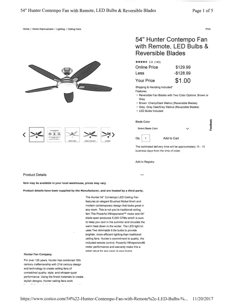 $1.00 online price on item # ‌1111282‌ - 54" hunter contempo fan with remote, led bulbs & reversible blades