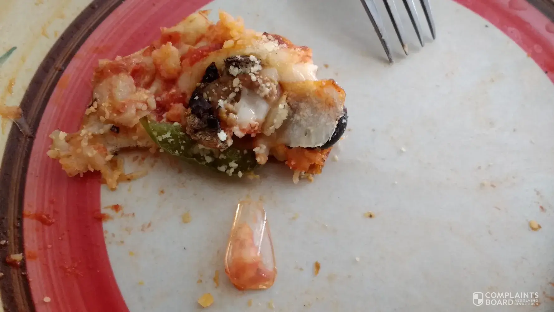 On Jan. 2, my wife was cutting a piece on her plate and found a finger tip-sized, clear plastic chip on the surface of her piece of pie. A photo of the chip on her plate is enclosed. The plastic appears to be either packaging or an artificial fingernail.