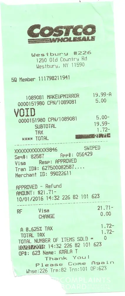 I am writing this to file a complaint against a customer service representative at Costco # 226, 1250 Old Country Road, Westbury, NY 11590. I am a member of Costco since 1995 and go there regularly. On 1 October, 2016, I went to the above location to return an item which I purchased a few days ago. On the return receipt (copy attached), there were multiple numbers printed. So to make sure I am getting back the amount I paid for the item, I asked her how much I am getting back. Her response was “read itâ€. I felt insulted. I believe that she responded this way because I look different. I do not know her name. There was some argument and she kept on saying “go and read it†as if I do not know how to read. All the people around me were listening, including the Costco employees.