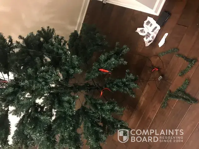 I was sent a defective tree which has exposed wires and sticky with tape. The product is a mess and it was noticeable that this item had been returned by another customer. Inside the box was a note from a woman in Florida requesting full credit. Extremely disappointed with your merchandise. Also missing the so called ornaments (stars). Kathleen Larvey 10 Starling Ave Kingston Ma 02364 Refund my purchase...