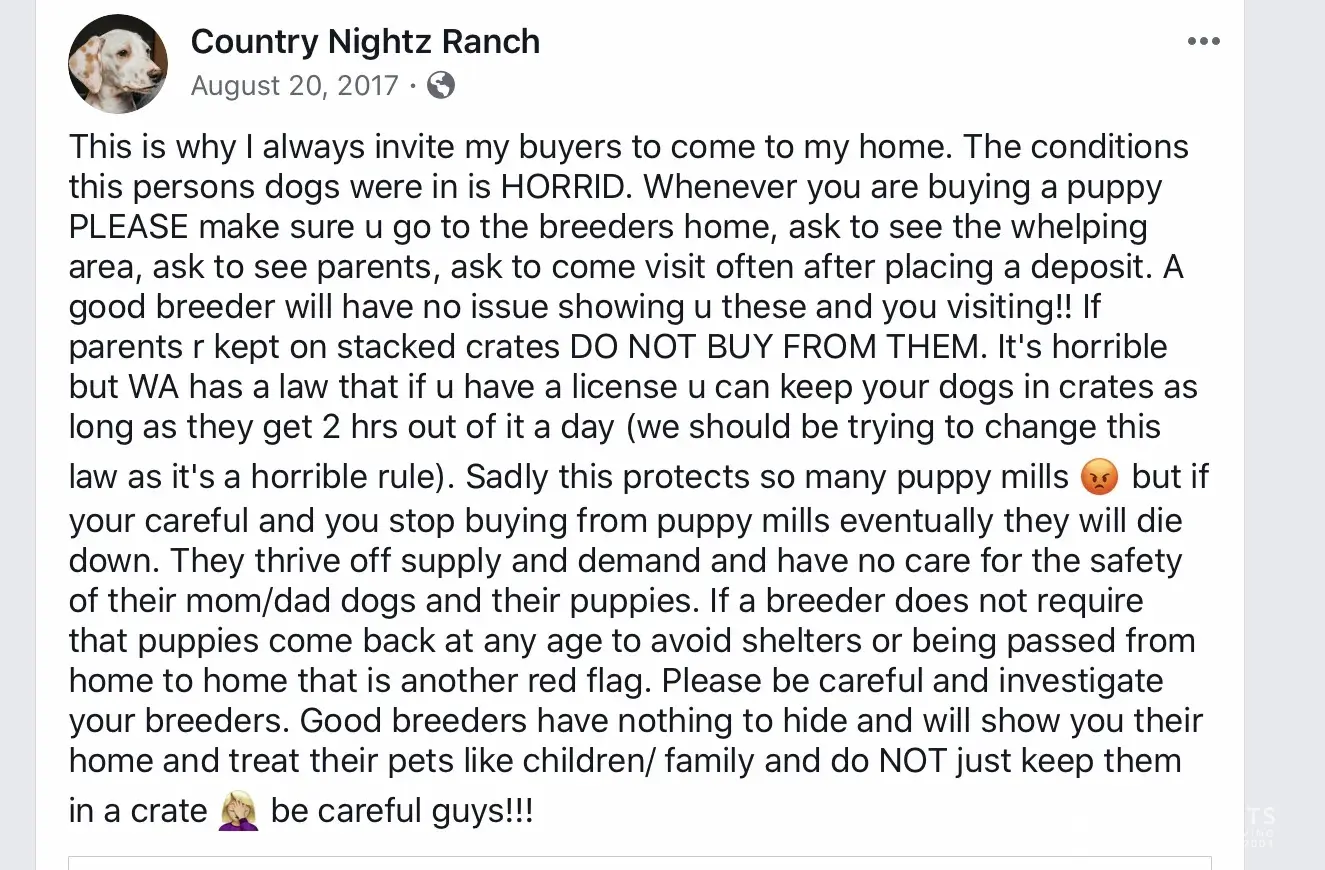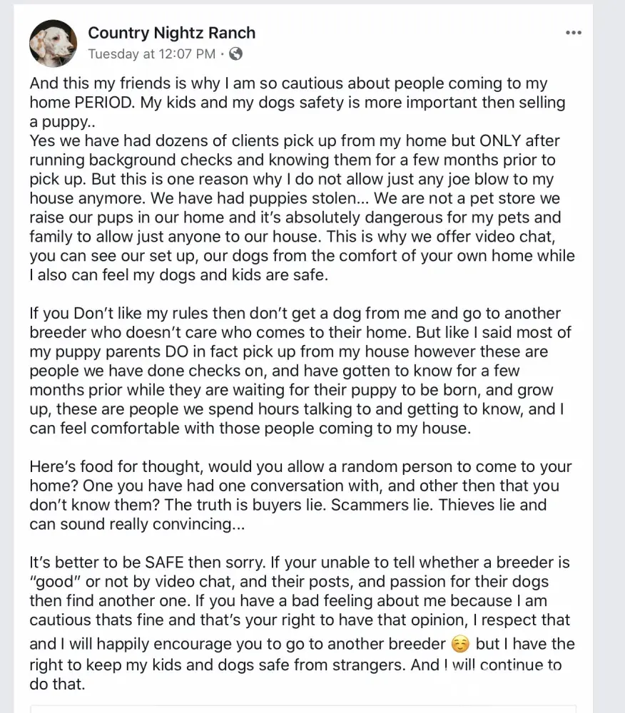 Thank you Roger! Many people are realizing this is a puppy mill. Also, if she had actually had puppies stolen she definitely would have posted about it. She posts everything else in her life on Facebook. It’s just another excuse why she won’t allow people on her property, when like you pointed out, she used to stress not buying a puppy from anyone that won’t allow a visit. She actually says “DO NOT BUY FROM THEM.” So take her own advise and DO NOT BUT FROM COUNTRY NIGHTZ RANCH.