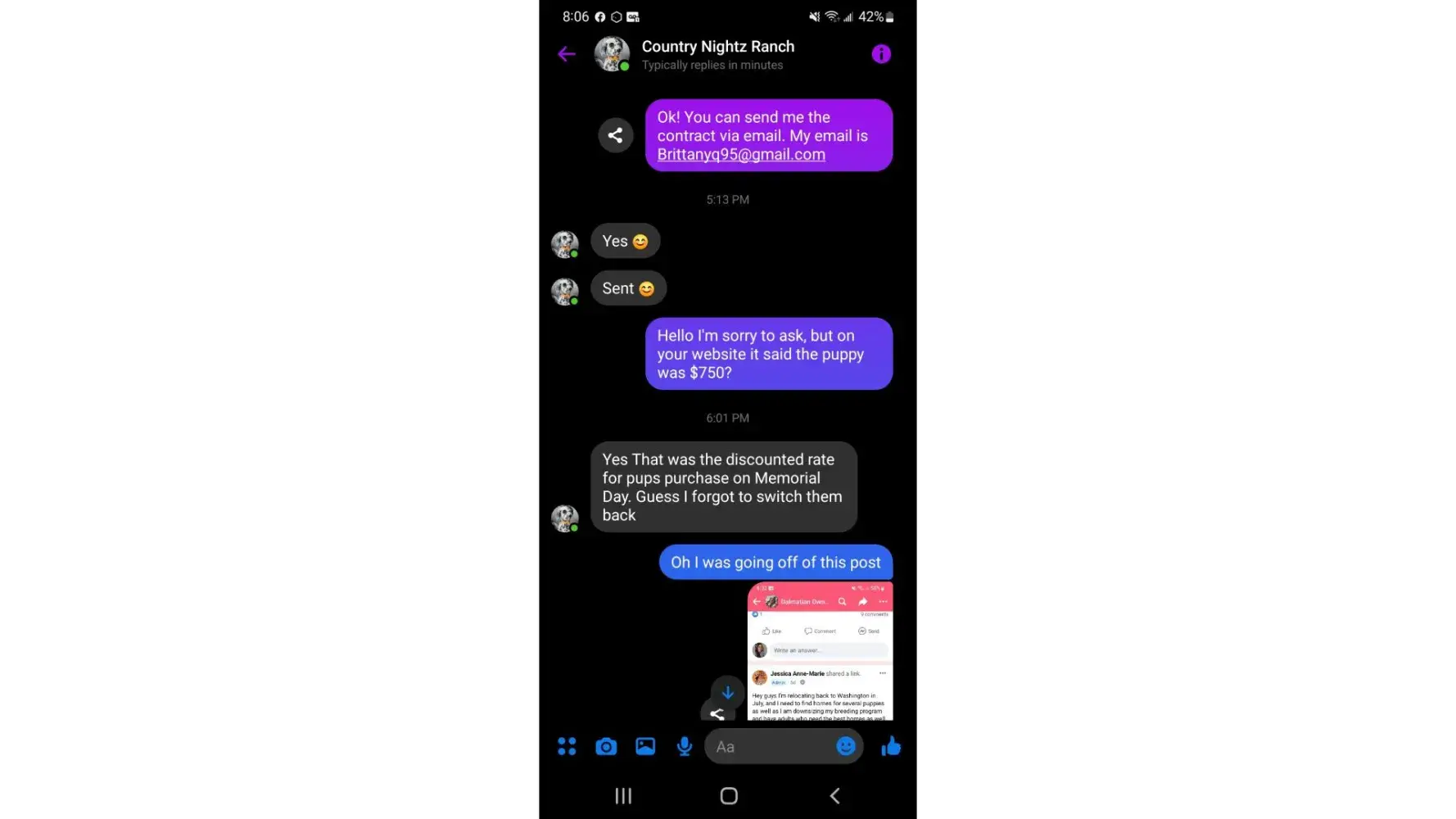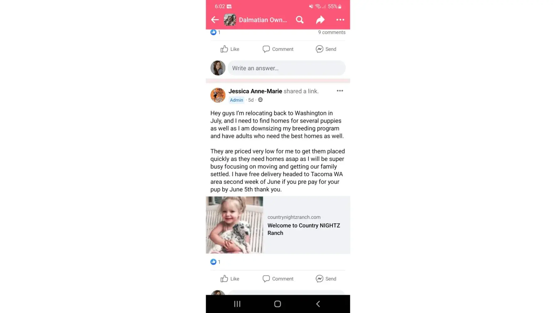 After searching for a Dalmatian puppy I contracted Country Nightz Ranch. It was apparent almost immediately that this was a puppy mill. When I asked about meeting the parents or coming over to pick a puppy (I mean who really wants to have their puppy picked for them) it was a hard no. She told me some sob story about an abusive ex. Well if you can't have people over to your house maybe dog breeding is not for you. She also said she feared parvo being brought onto her property... Well aren't her an her kids just as likely to bring parvo home? Those poor kids are being raised at a puppy mill where dogs and puppies are thought of as stock. She says she loves her dogs. If that were true she wouldn't be constantly selling them off or putting them in "guardian" homes.