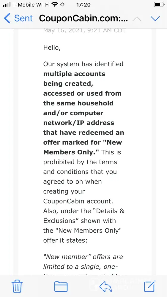 Couponcabin flagged my account, then told me to send my driver's license to verify my address and made it sound like that would resolve the issue. Odd, but I did as instructed. Immediately after that, they proceeded to say someone at my ip network (and think if you work in an office building?) broke their terms. They deleted my account and stole my member...