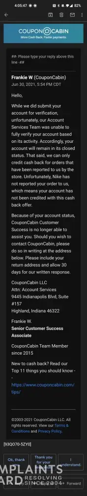 Honestly, this whole thing is a total scam. CouponCabin waits until customers redeem offers or use their links so that they can collect the commission from purchases, and then they turn around and terminate people's accounts and refuse to give them the cash back they earned. It's totally unfair and dishonest.