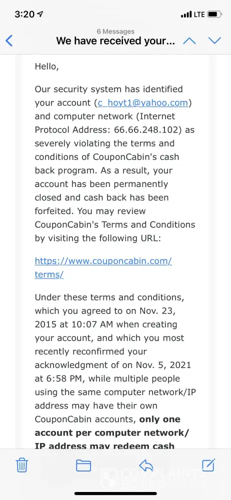I'm very careful about cashback websites' terms, so I made sure to tell the rest of my family who lived with me that I had an account open, and no one else should open one. However, I couldn't resist telling my sister, who is married and lives out of state, to open an account as I had made $100s of dollars in cashback. She had been using it for a while, and then she came to visit me at my house. While she was here, she used my computer and placed a couponcabin order. That's when things went south.