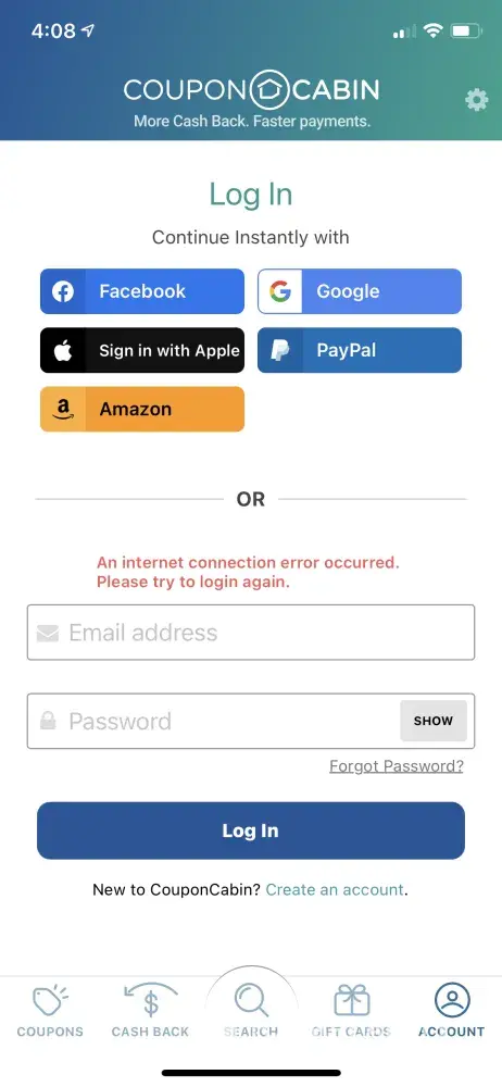 But let me tell you, those big cash back offers are a scam. And if you dare to challenge CouponCabin about it, they'll just shut down your account with no warning. When you try to go to their website, you'll just see a message saying you violated their terms.