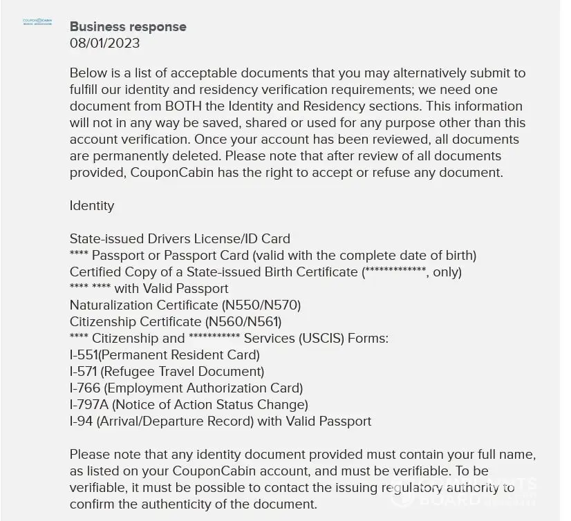 Their standard response to all of their complaints. It is unreasonable to ask for such personal documentation. How do we know who your employees are and they are not going to use our personal documents for identity fraud. CouponCabin stating that they are a completely free service is bull, it maybe free to the people clicking on the links, but it is not free to the stores, they are paying you. CouponCabin is collecting a percentage from the stores plus keeping the reimbursements for the members only cashback such as the $100 off of $100. To state just take a few minutes and once verified, accounts are restored is bogus. Once we send you state issued photo ID and your employees commit identity fraud with our documents, it will take years, if ever, to undo. You don't need state issued ID or a copy of someone's credit card statement or a birth certificate. CouponCabin has nerve to even ask for this information.