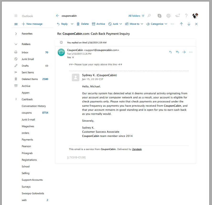 At no point would Sydney K. elaborate on what this "unnatural activity" was, nor has anyone else. In any case, they very clearly did not deem my account to have accrued money by committing fraud, otherwise they would have terminated my account because of that and stated that I would not receive my money because of these concerns. However, Sydney K. plainly stated that my account was in good standing, and that I would receive my money. Therefore, CouponCabin's lawyer very clearly lied to the Attorney General's Office in Indiana just to avoid paying a measly $76.86, which I lawfully earned.