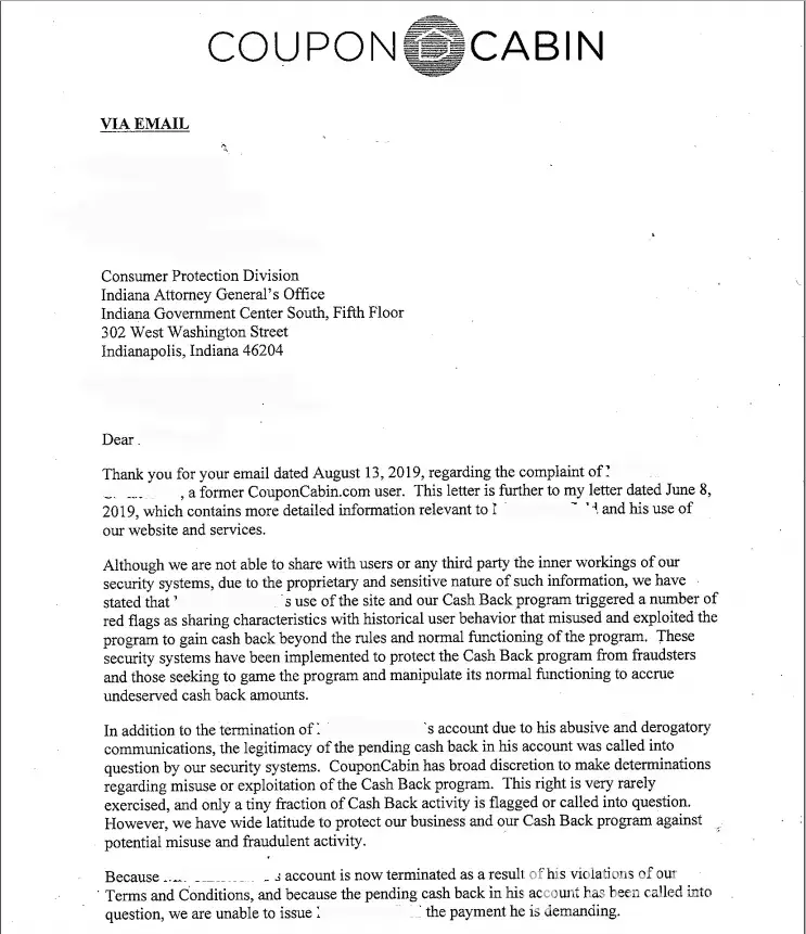 I filed a complaint with the Indiana Attorney General's Office, and I provided plenty of supporting documentation regarding my claim for reimbursement. When the AG's office finally got back to me, I was informed that they had no enforcement authority and were only there to mediate. Since CouponCabin was denying my claim, there was nothing they could do. After reading CouponCabin's response, however, I was appalled. Their lawyer blatantly lied. I'm going to attach some documents demonstrating these lies. I'm included a couple of emails from the customer service representative that reference why my account was terminated and also that my account was in good standing, and I will include a redacted copy of most of the letter from CouponCabin's lawyer to the AG's office. Based on these three documents, it will be clear that CouponCabin's lawyer lied to the AG's office.