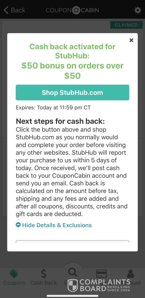 CouponCabin falsely advertised 15% off StubHub tickets and $50.00 cash bonus for purchasing tickets through CouponCabin.com for StubHub. Please see the attached screenshots. I subsequently purchased NBA tickets from each ad, and contacted CouponCabin regarding the status of the discounts. CouponCabin gave me canned responses, and in an email stated: "your order was credited to a different website and not to CouponCabin.com." When I contacted StubHub regarding this issue, StubHub stated that they have no affiliate marketing agreement with CouponCabin! Is StubHub in on this, since they seem to be the financial beneficiary of these false advertisements. I relied on this false ads, then purchased full price tickets through StubHub.
