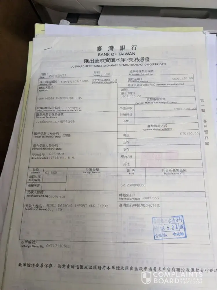 I sent deposit of USD4680 to purchase on 2 occassions USD3120 and usd1560 TOTAL USD4680. USD3120 was to Place and order and USD1560 when goods are ready for loading. But supplier scammed me. send me fake shipping delivery order and asked for balance payment USD10,920.00. When i refused reason as per contract they suppose to ship the goods and send me...