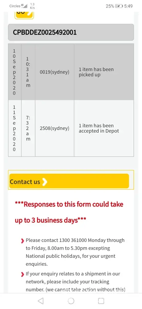After 12 days and no sign of the parcel moving from Sydney, I spoke to a Courier Please customer representative on the phone and she assured me that she had contacted the driver and the parcel would get to the customer in time. She also said the resolution centre would contact me and confirmed with me that I could contact the customer and let them know that the parcel was on its way.