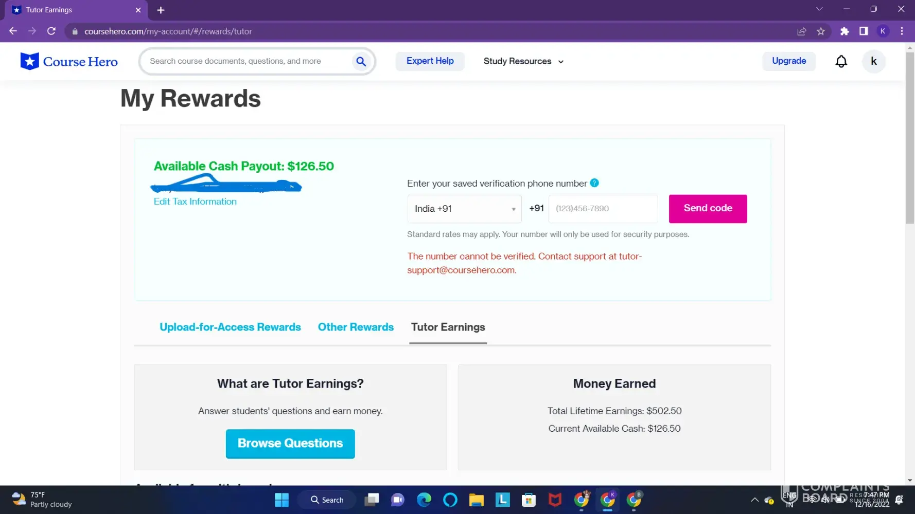 Last December 8 around 1pm, I was about to cash-out my earnings but before cash-out, it needed SMS verification. After I input my phone number it says "my account could not be verified and some features have been blocked. Contact tutor support for details." I then emailed [protected]@CourseHero.com.