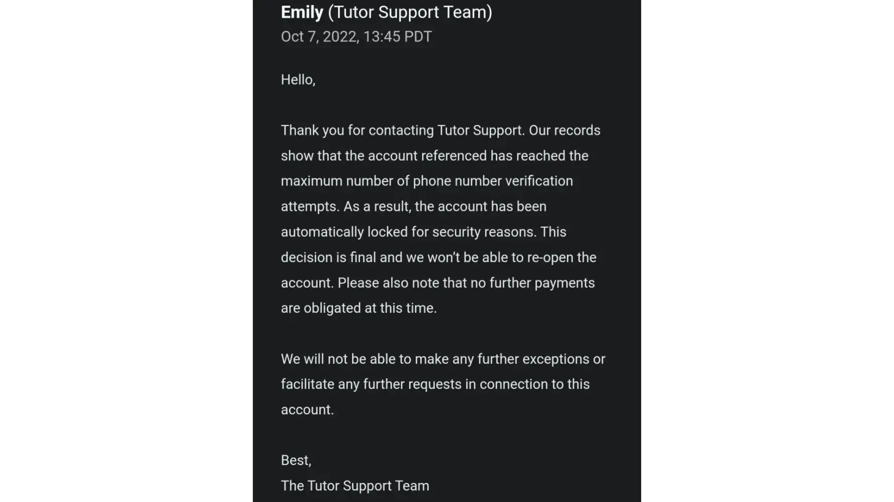"Our records show that the account referenced has reached the maximum number of phone number verification attempts. As a result, the account has been automatically locked for security reasons. This decision is final and we won’t be able to re-open the account. Please also note that no further payments are obligated at this time."